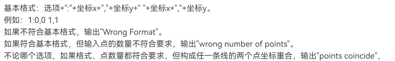 通过两次循环来判断 构成任一条线的两个点坐标是否重合,如果是则输出"points coincide",否就按照要求来执行主要的程序。