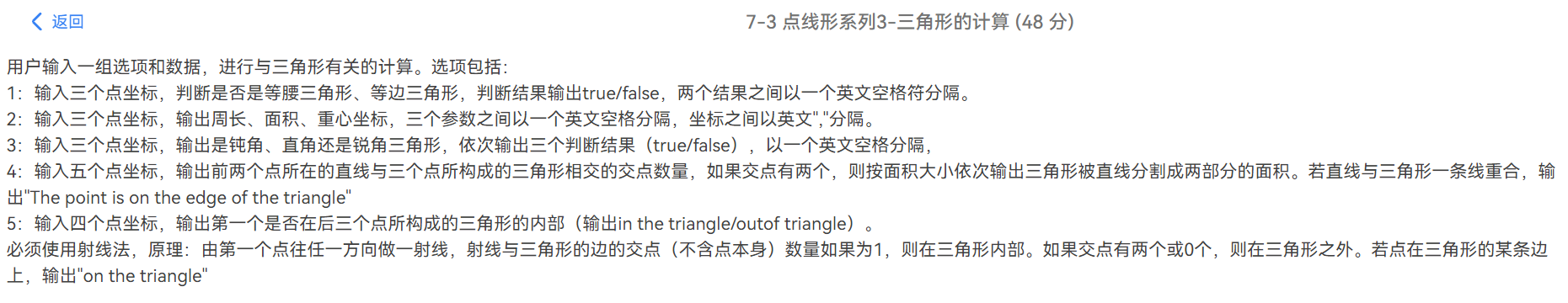 第三题三角形计算,要求输入选项和点的坐标来实现要求,这道题和上面的题目相比较难度又是加大了的,我也是没有写完这道题后面两个选项的要求也没有去写。这里就只对我写了的进行分析。