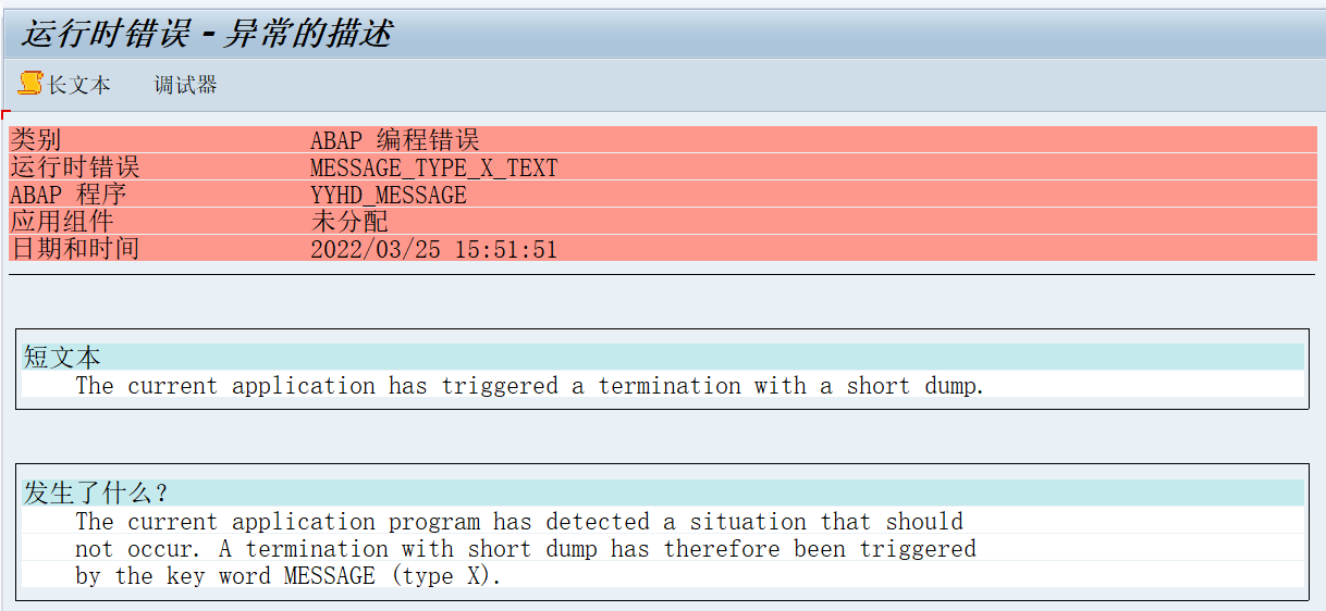 消息类型包含:S成功 E错误(程序终止) W警告 I消息框(弹出消息框) A错误(弹出框) X系统错误 这六种类型