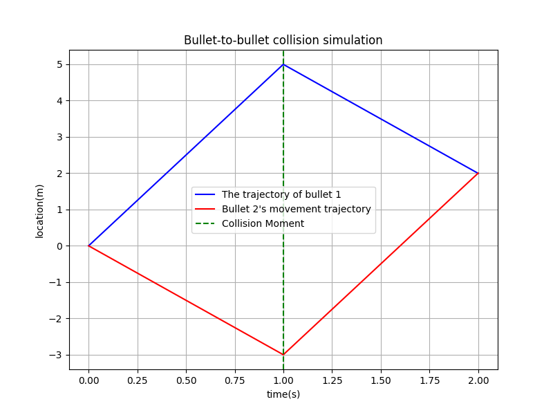 - 运动轨迹:我们使用了 numpy 的 linspace 函数来模拟时间,计算碰撞前后两颗子弹的位移,并在碰撞发生时改变它们的运动轨迹。