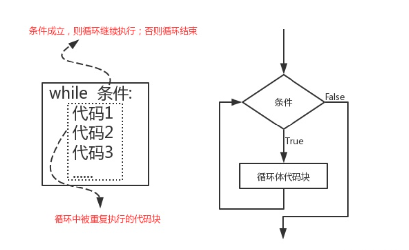 while 条件: 代码1 代码2 代码3 while的运行步骤: 步骤1:如果条件为真,那么依次执行:代码1、代码2、代码3、...... 步骤2:执行完毕后再次判断条件,如果条件为True则再次执行:代码1、代码2、代码3、......,