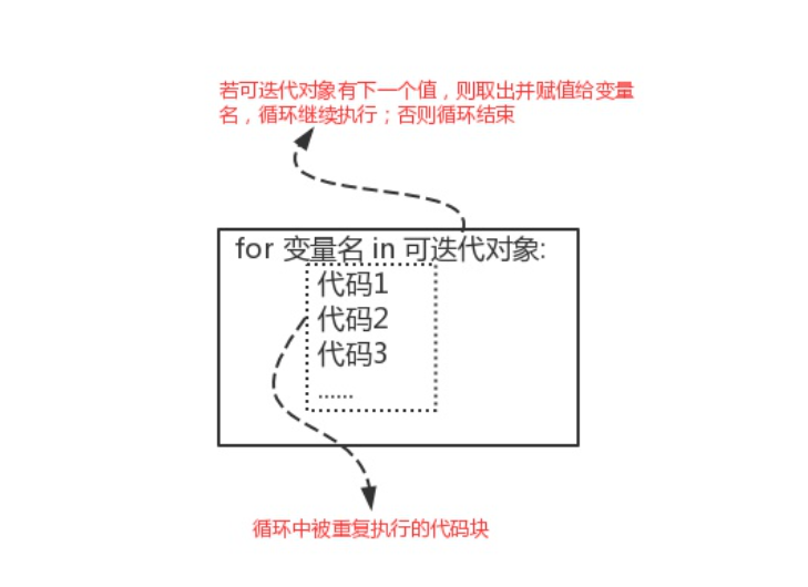 for 变量名 in 可迭代对象: # 此时只需知道可迭代对象可以是字符串\列表\字典,我们之后会专门讲解可迭代对象