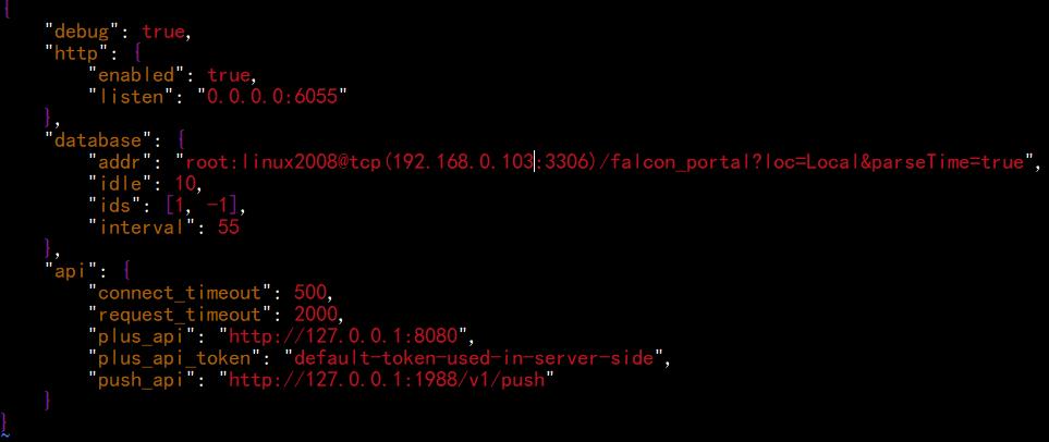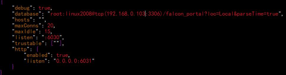 "database": "root:linux2008@tcp(192.168.0.103:3306)/falcon_portal?loc=Local&parseTime=true"