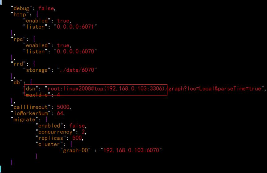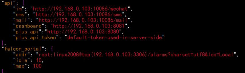 "dsn": "root:linux2008@tcp(192.168.0.103:3306)/falcon_portal?loc=Local&parseTime=true&wait_timeout=604800", "maxIdle": 4