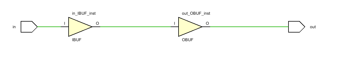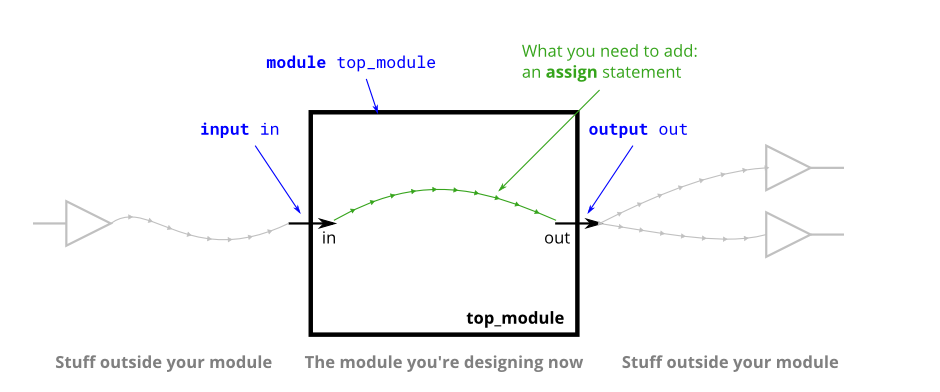 3.The diagram below illustrates how each part of the circuit corresponds to each bit of Verilog code. The module and port declarations create the black portions of the circuit. Your task is to create a wire (in green) by adding an assign statement to connect in to out. The parts outside the box are not your concern, but you should know that your circuit is tested by connecting signals from our test harness to the ports on your top_module.