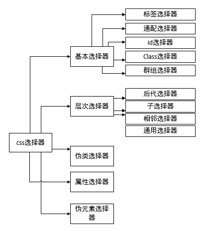 ---css选择器大致分成5类:基本选择器、层次选择器、伪类选择器、属性选择器、伪元素选择器。(如下图)