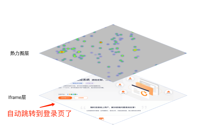 在不需要登录的网页(如:官网)上画热力图比较方便,热力数据直接覆盖就行了。但是当网页需要鉴权的时候,如:需要登录。那么打开页面的时候,网页就是会因为需要鉴权而自动跳转到登录页,这样热力图数据就完全失效了。如图所示: