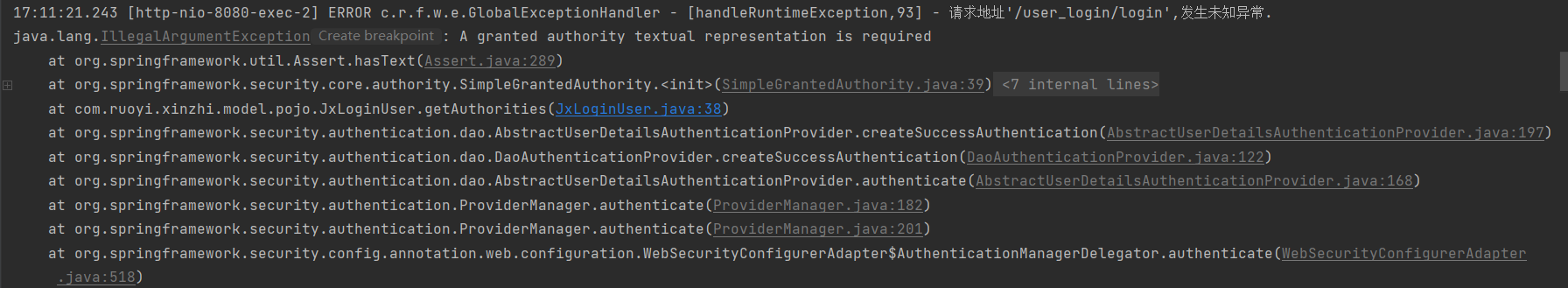 Debug 跑后 排查是 Security 中的 UserDetails.getAuthorities() 在创建 SimpleGrantedAuthority authority 时,所传递的授权信息是空的,导致 SimpleGrantedAuthority authority 出现异常;