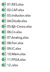 先对需建立的库元件进行分类,初步分11类,后期有需求再添加,分类情况如下,其中先制作部分电阻库,跑通整个CIS库建立流程,其中电阻库表格部分内容如下: