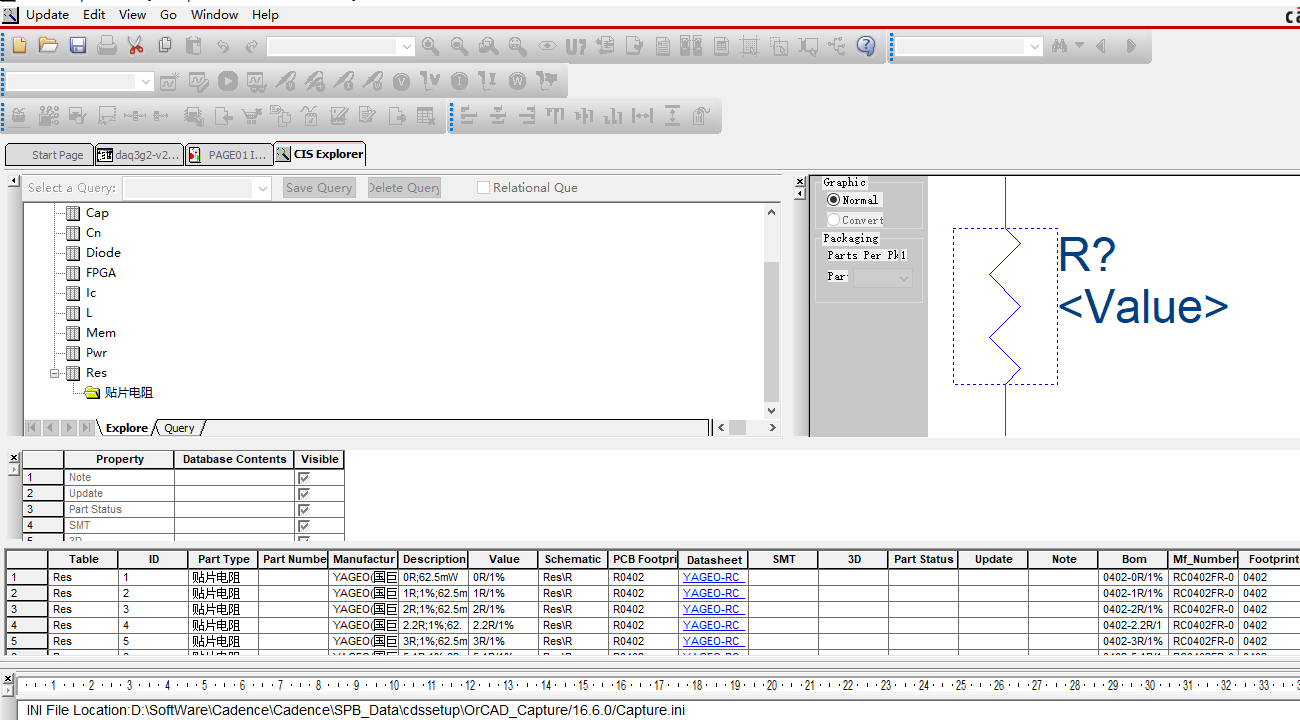 实际效果如图所示,点击datasheet栏可直接打开对应器件的datasheet。到此整个CIS库基本建立完成。后续还需要补充大量元器件,以及设定相应的元件库管理规则。