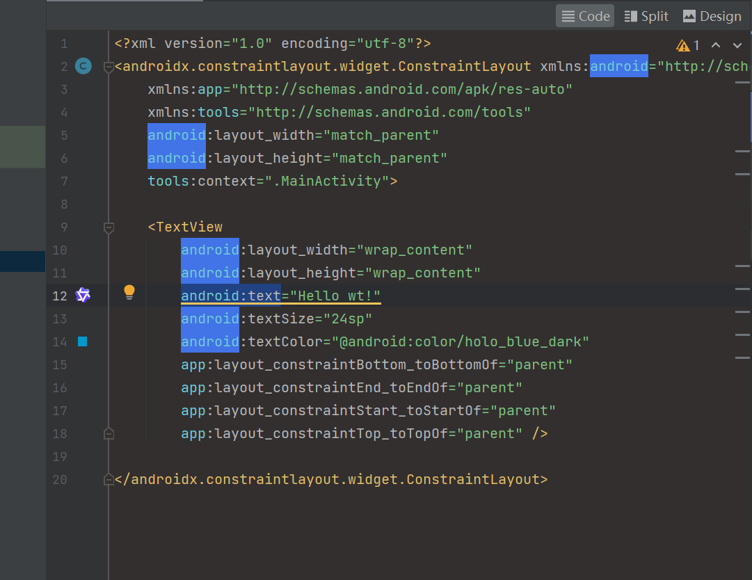 <TextView android:layout_width="wrap_content" android:layout_height="wrap_content" android:text="@string/hello_android" android:textSize="24sp" android:textColor="@android:color/holo_blue_dark" app:layout_constraintBottom_toBottomOf="parent" app:layout_constraintEnd_toEndOf="parent" app:layout_constraintStart_toStartOf="parent" app:layout_constraintTop_toTopOf="parent" />