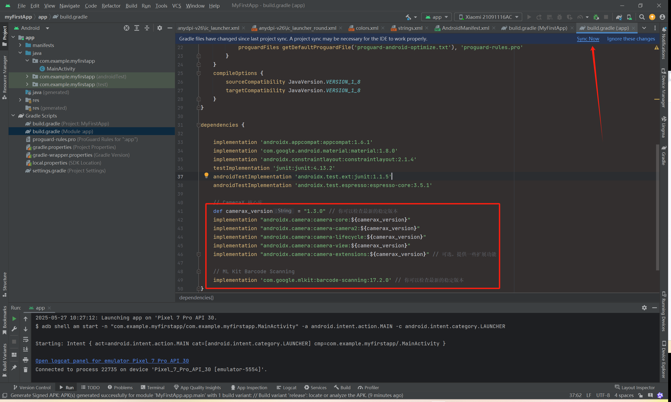 添加完后,点击 Android Studio 顶部出现的 "Sync Now" 链接,让 Gradle 同步项目依赖。