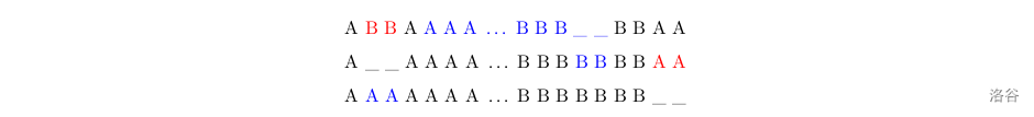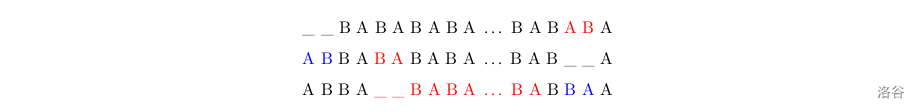 因此,我们可以定义函数 \(solve(n,x)\) 表示将 \(x+1\) 到 \(x+2n\) 的格子(这些包裹形如 \(BABABA\cdots BA\) )移植编号为 \(x-1\) 到 \(x+2n-2\) 的格子,并排列成 \(AA\cdots AB\cdots BB\) 。