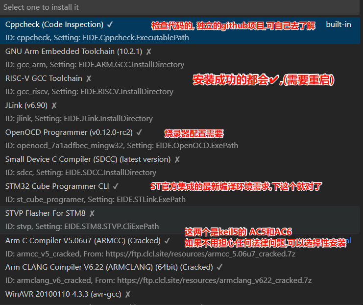 在新一些版本的EIDE中, 其内部已经集成了线上安装下载的功能, 所以你不用跟着csdn那些陈年教程一步一步的配置下载. 只需要进去实用工具链的界面, 然后点击下载即可.
