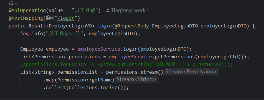 用户登录后,系统通过 employee_role 表查询用户所拥有的所有角色,再通过 role_permission 表获取其对应的权限,并将其缓存至 JWT 或 ThreadLocal,供后续权限校验使用。该结构支持灵活扩展与权限解耦,增强了系统的适应性。