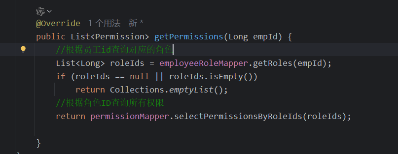 根据员工 ID 查询其角色,并进一步获取权限列表。
