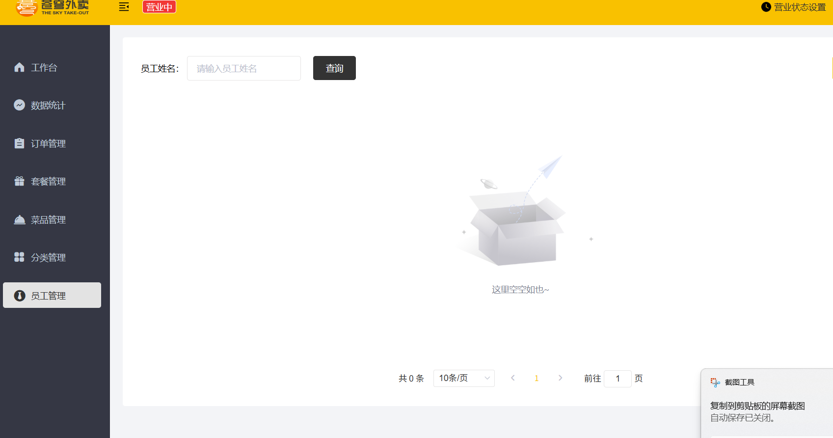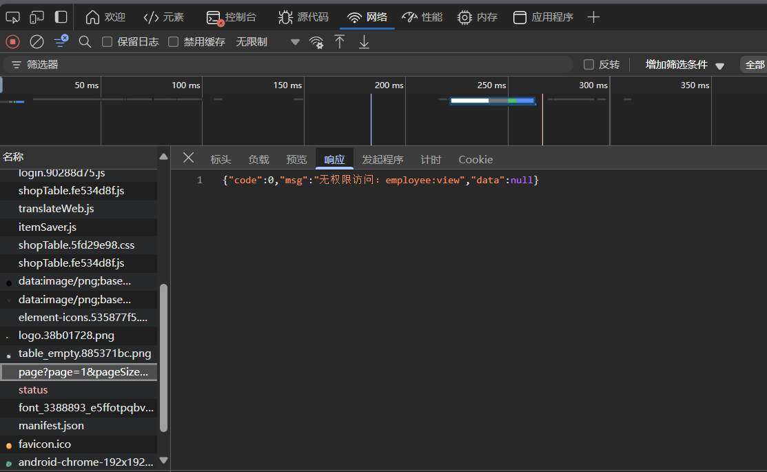 随后使用店铺管理员账户登录,员工管理页面无法加载数据,抓包结果显示后端返回了“无权限”的提示信息,正是我们在全局异常处理器中设置的响应内容,验证了权限校验机制的生效。