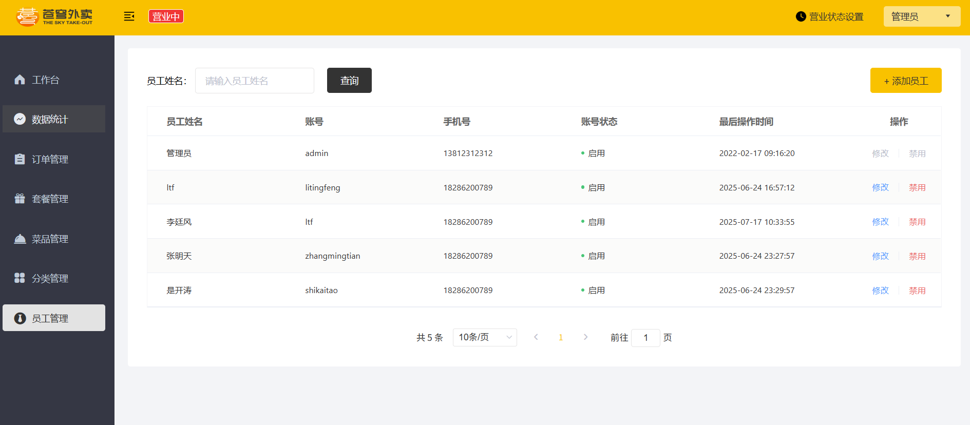 首先使用管理员账户登录,成功访问员工管理页面,具备添加与修改等权限。