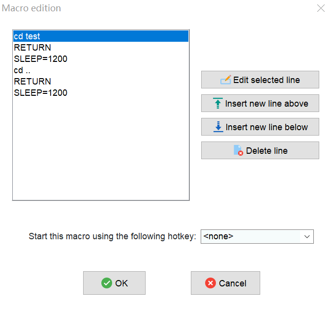 一般第一行是命令,第二行是RETURN(键盘按下Enter键),第三行是休眠时间(其实就是等待时间,看实际选择,一次命令执行时间,一般填500,这里默认ms)。