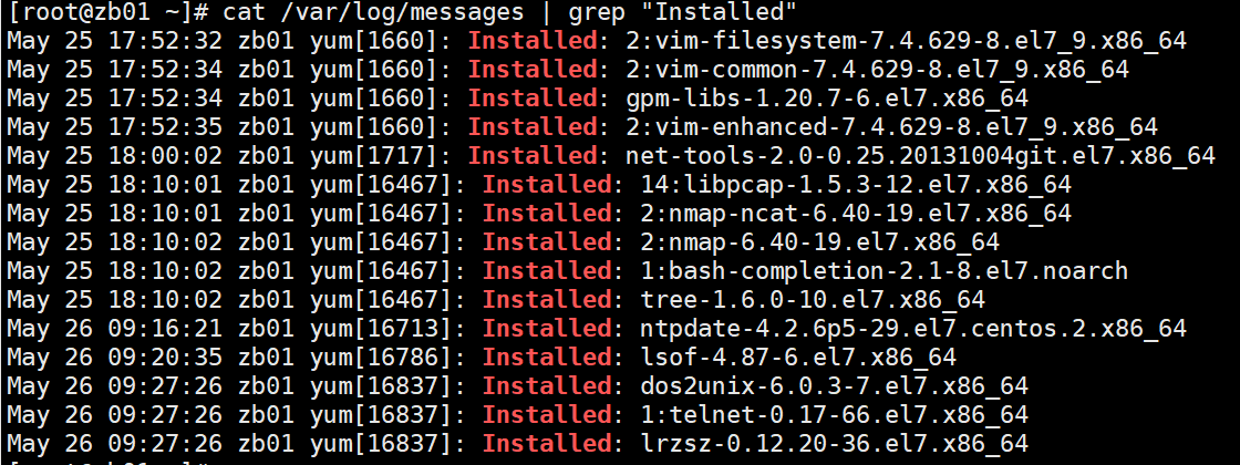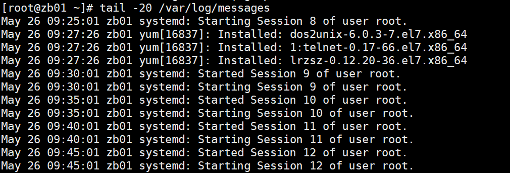 就yum程序而言:通过日志我们可以知道,5月26号上午9:27,在zb01主机上使用yum下载安装了三个软件(dos2unix telnet lrzsz)。