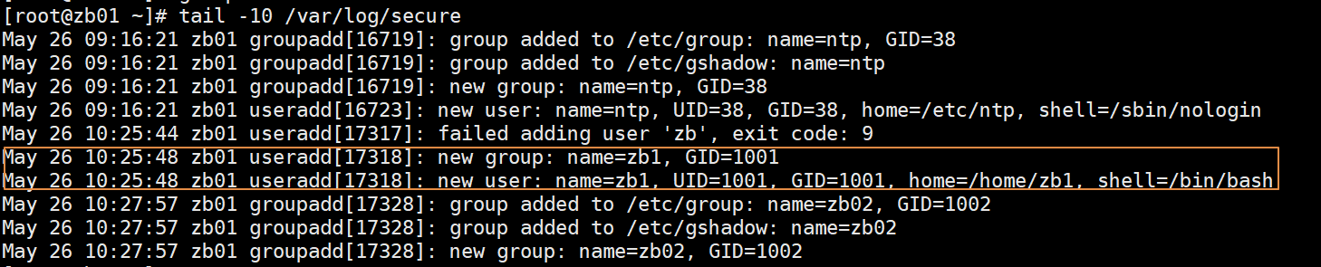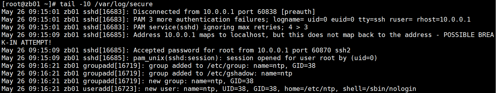 secure日志记录了用户登录相关信息:上图第五行数据,表示5月26号9:15,从主机10.0.0.1成功远程登录主机zb01