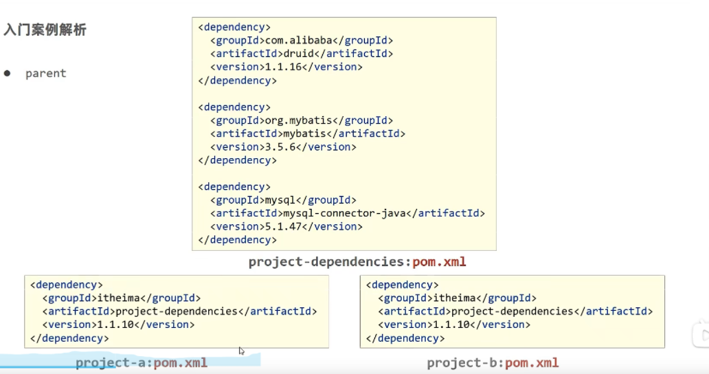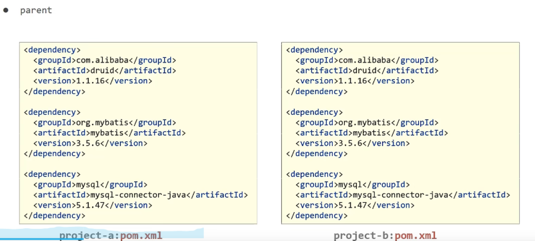 parent是把一大坨依赖进行集中管理,只定义了,但是不用,并且规定了版本号,就是你是使用的那个功能,哪个版本最好用,我给你弄好了,你直接写坐标就行,不用写版本