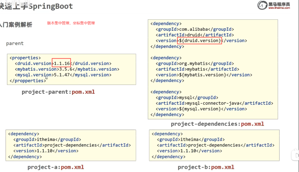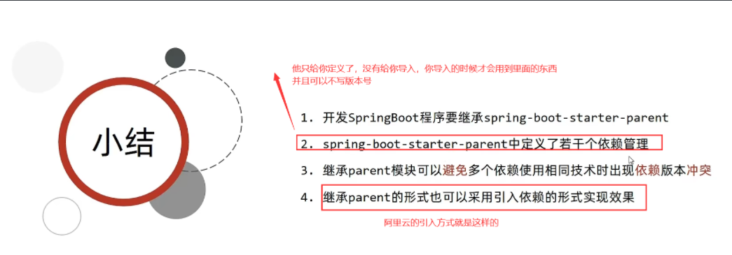 spring-boot-starter-parent他继承了spring-boot-dependencies,它定义了多个properties属性,同时定义了若干个坐标管理,引用他自定义的那些属性,当我们在使用的时候,我们只需要引入坐标,不需要写版本