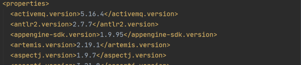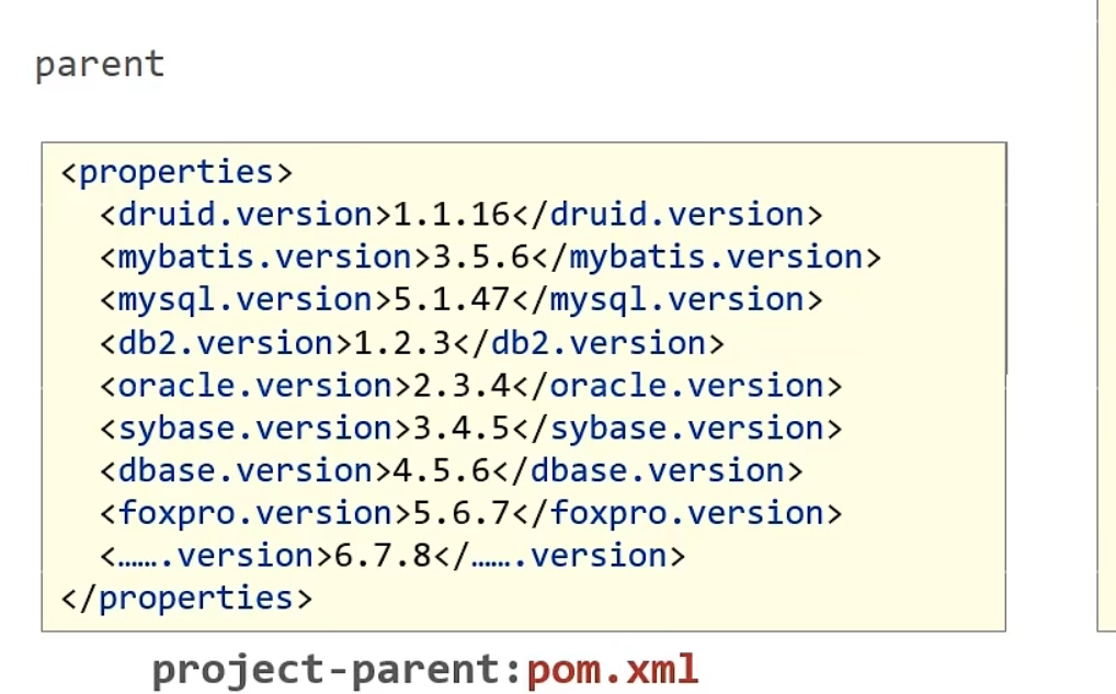 将抽取出来的依赖项,版本号(version)进行集中地管理,坐标(xxx)进行集中的管理,将用过的这些版本统一管理,配置成Maven的属性,右边这一块直接引用配置好的坐标就行,只需要进行坐标管理,不进行版本的管理