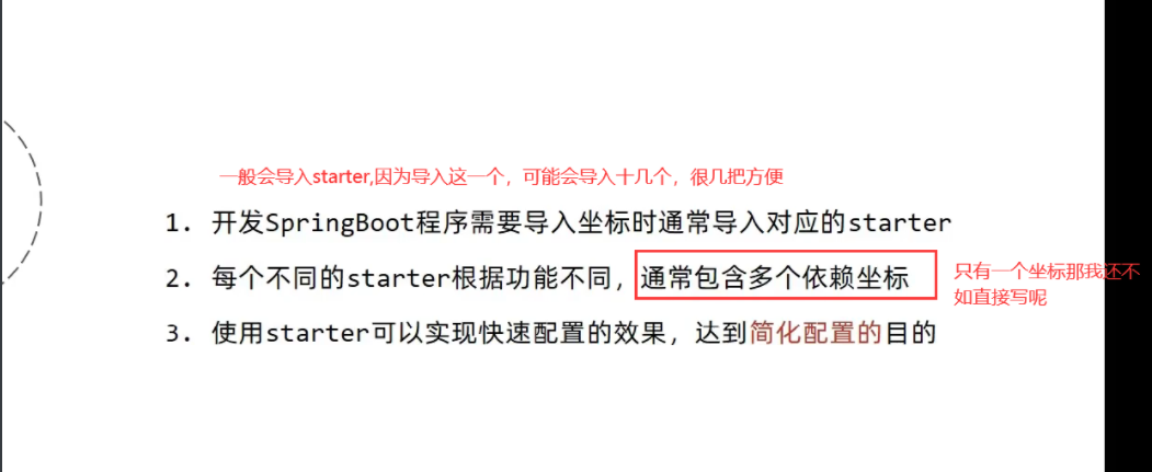 所以,我们可以通过starter来实现我们快速的配置,当然目前讲的只是它功能很小的一部分,我们在SpringBoot当中使用的坐标基本都是一个又一个大饼,大饼里面包含了很多很多的小饼,以前我开发项目A我需要导入20个坐标,那么现在我再次开发项目A使用SpringBoot来做,那么只需要导入一个坐标就行,因为剩下的坐标,他已经帮我导入好了