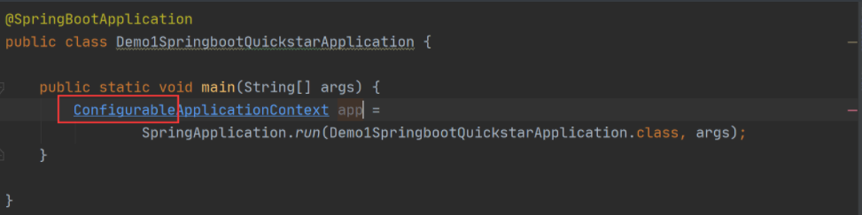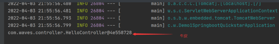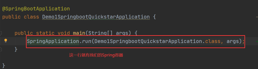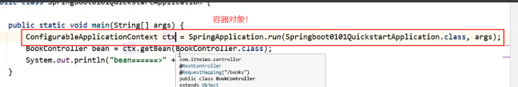 public static void main(String[] args) { ConfigurableApplicationContext app = SpringApplication.run(Demo1SpringbootQuickstarApplication.class, args); // 把Bean拿出来看看能不能打印,他是否帮我们自动注入到容器当中了? HelloController helloController = (HelloController) app.getBean("helloController"); // 打印 System.out.println(helloController); }