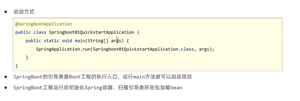 这个类是引导类,是整个Boot工程的执行入口,运行这个main方法就行,运行完之后会得到一个Spring容器,Boot初始化Spring容器,然后扫描这个类所在包及其子包,加载我们配置的Bean,进行我们项目的运行