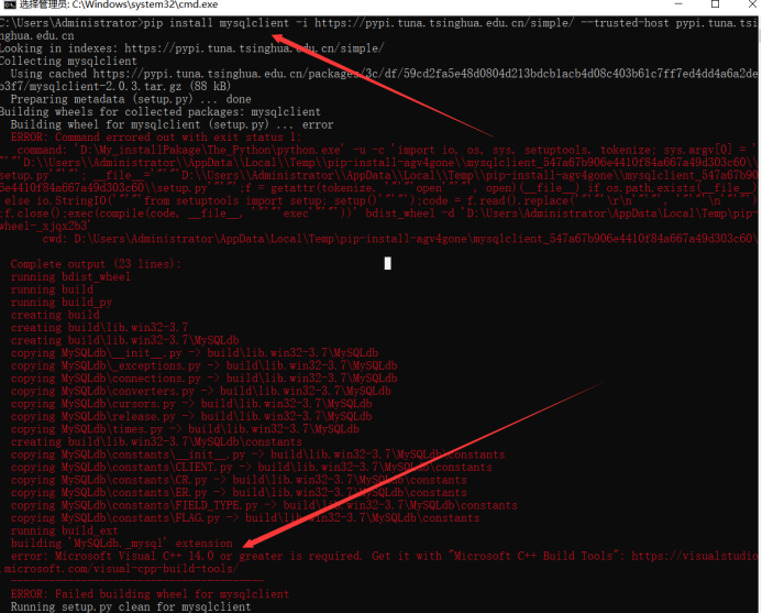 我这里是安装mysqlclient时候报的缺少 Microsoft Visual C++ 14.0 or greater错,所以,你可以在这个网站https://www.lfd.uci.edu/~gohlke/pythonlibs/里找这个mysqlclient对应需要的python工具包