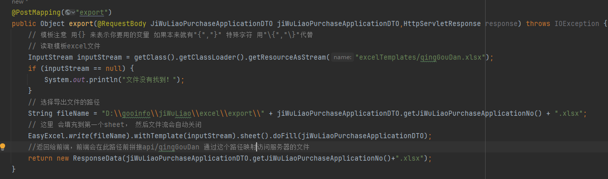 这里代码的主要作用是 先提取excel模版,然后选择导出到什么位置,最后填充模版以后,将导出的位置,也就是文件在系统里的相对路径返回给前端。