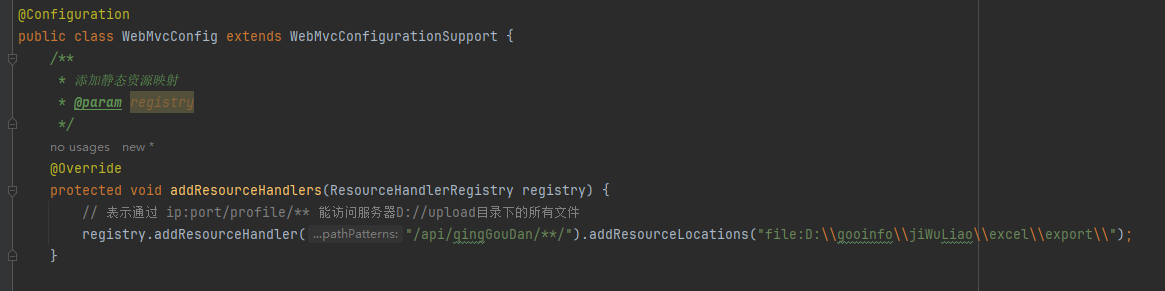 registry.addResourceHandler("/api/qingGouDan/**/").addResourceLocations("file:D:\\gooinfo\\jiWuLiao\\excel\\export\\");