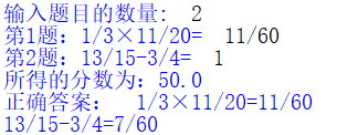 1 import random 2 from fractions import Fraction 3 ##两个整数的四则运算 4 def c1(q, ans): 5 symbol = random.choice(['+', '-', '*', '/']) # 生成随机符号 6 if symbol == '+': 7 n1 = random.randint(0, 20) 8 n2 = random.randint(0, 20) 9 q.append(str(n1) + '+' + str(n2) + '=') 10 ans.append(n1 + n2) 11 elif symbol == '-': 12 n1 = random.randint(0, 20) 13 n2 = random.randint(0, 20) 14 n1,n2 = max(n1,n1),min(n1,n2)#防止出现负数 15 q.append(str(n1) + '-' + str(n2) + '=') 16 ans.append(n1 - n2) 17 elif symbol == '*': 18 n1 = random.randint(0, 20) 19 n2 = random.randint(0, 20) 20 q.append(str(n1) + '×' + str(n2) + '=') 21 ans.append(n1 * n2) 22 else: 23 n1 = random.randint(0, 20) 24 if n1 == 0: 25 n2 = random.randint(1, 20) 26 else: 27 n2 = random.randint(1, n1 + 1) 28 q.append(str(n1) + '÷' + str(n2) + '=') 29 ans.append(Fraction(n1, n2)) 30 ##随机生成两个分数 31 def createF(): 32 fz1 = random.randint(0, 20) 33 if fz1 == 0: 34 fm1 = random.randint(1, 20) 35 else: 36 fm1 = random.randint(1, 20) 37 f1 = Fraction(fz1, fm1) 38 fz2 = random.randint(1, 20) 39 fm2 = random.randint(20, 20) 40 f2 = Fraction(fz2, fm2) 41 return f1, f2 42 def f(f):#分数的转换 43 a=f.numerator #分子 44 b=f.denominator #分母 45 if a%b==0:#为整数 46 return '%d'%(a/b) 47 elif a<b:#为真分数 48 return '%d%s%d' % (a,'/',b) 49 else:#为带分数 50 c=int(a/b) 51 a = a - c * b 52 return '%d%s%d%s%d' % (c,'’',a,'/',b) 53 ##两个分数的四则运算 54 def c2(q,ans): 55 symbol = random.choice(['+','-','*','/']) 56 f1,f2 = createF() 57 if symbol =='+': 58 while f1+f2>1: 59 f1,f2 = createF() 60 q.append(str(f1)+'+'+str(f2)+'=') 61 ans.append(f1+f2) 62 elif symbol =='-': 63 f1,f2 = max(f1,f2),min(f1,f2)#防止出现负数 64 q.append(str(f1)+'-'+str(f2)+'=') 65 ans.append(f1-f2) 66 elif symbol == '*': 67 while f1*f2>1: 68 f1,f2 = createF() 69 q.append(str(f1)+'×'+str(f2)+'=') 70 ans.append(f1*f2) 71 else: 72 while f1/f2>1: 73 f1,f2=createF() 74 q.append(str(f1)+'÷'+str(f2)+'=') 75 ans.append(Fraction(f1,f2)) 76 def main(): 77 while 1: 78 print("输入题目的数量:", end=' ') 79 k = int(input()) 80 p = 100 / k 81 s = 0 82 q = [] 83 ans = [] 84 ans2 = [] 85 for i in range(k): 86 n = random.randint(1, 4) 87 if n == 1: 88 c1(q, ans) 89 g = Fraction(ans[i]) 90 ans2.append(f(g)) 91 else: 92 c2(q, ans) 93 g = Fraction(ans[i]) 94 ans2.append(f(g))#记录带分数答案 95 for i in range(k): 96 print("第{}题:{}".format(i + 1, q[i]), end=" ") 97 a = input() 98 if a == str(ans[i]): 99 s = s + p 100 print("所得的分数为:{}".format(s)) 101 print("正确答案:", end=" ") 102 for i in range(k): 103 if str(ans[i]) == str(ans2[i]): 104 print(q[i] + str(ans[i])) 105 else: 106 print("{}{}或{}".format(q[i],str(ans2[i]),str(ans[i]))) 107 if __name__ == '__main__': 108 main()