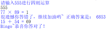 1 import random 2 #四则运算 3 def szys(): 4 sym = ['+', '-', '×', '÷'] 5 f= random.randint(0, 3) 6 n1 = random.randint(1, 99) 7 n2 = random.randint(1, 99) 8 result = 0 9 if f== 0:#加法 10 result = n1 + n2 11 elif f == 1:#减法,要先比较大小,防止输出负数 12 n1, n2 = max(n1, n2), min(n1, n2) 13 result = n1 - n2 14 elif f== 2:#乘法 15 result = n1 * n2 16 elif f == 3:#除法,要比较大小,并循环取整除 17 n1, n2 = max(n1, n2), min(n1, n2) 18 while n1 % n2 != 0: 19 n1 = random.randint(1, 10) 20 n2 = random.randint(1, 10) 21 n1, n2 = max(n1, n2), min(n1, n2) 22 result = int(n1 / n2) 23 print(n1, sym[f], n2, '= ', end='') 24 return result 25 print('请输入555进行四则运算') 26 n=int(input()) 27 #当输入555时,进行四则运算,调用函数szys() 28 if n==555: 29 while True: 30 result = szys() 31 j= input() 32 s= int(j) 33 if s== result : 34 print('Bingo~恭喜你答对了!') 35 else: 36 print('很遗憾你答错了,继续加油哟~ 正确答案是:', result )