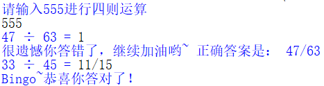 1 import random 2 #四则运算 3 from fractions import Fraction 4 def f(f):#分数的转换 5 a=f.numerator #分子 6 b=f.denominator #分母 7 if a%b==0:#为整数 8 return '%d'%(a/b) 9 elif a<b:#为真分数 10 return '%d%s%d' % (a,'/',b) 11 else:#为带分数 12 c=int(a/b) 13 a = a - c * b 14 return '%d%s%d%s%d' % (c,'’',a,'/',b) 15 def szys(): 16 sym = ['+', '-', '×', '÷'] 17 f= random.randint(0, 3) 18 n1 = random.randint(1, 99) 19 n2 = random.randint(1, 99) 20 result = 0 21 if f== 0:#加法 22 result = n1 + n2 23 elif f == 1:#减法,要先比较大小,防止输出负数 24 n1, n2 = max(n1, n2), min(n1, n2) 25 result = n1 - n2 26 elif f== 2:#乘法 27 result = n1 * n2 28 elif f == 3:#除法,要比较大小 29 result =Fraction(n1, n2) 30 print(n1, sym[f], n2, '= ', end='') 31 return result 32 print('请输入555进行四则运算') 33 n=int(input()) 34 #当输入555时,进行四则运算,调用函数szys() 35 if n==555: 36 while True: 37 result = szys() 38 j= input() 39 40 if j== f(result ): 41 print('Bingo~恭喜你答对了!') 42 else: 43 print('很遗憾你答错了,继续加油哟~ 正确答案是:', result )