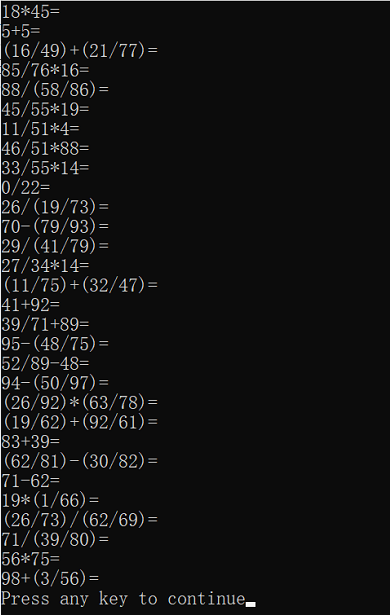 先利用rand()函数随机生成两个算数,包括100以内的整数和真分数,生成100以内的整数,用rand()%100,为了避免在除法运算中除数不能为零,所以运算符右边的整数直接用1+rand()%99;在随机生成真分数时,我先生成两个整数,来充当分子和分母,同样分母不能为零,用1+rand()%99。加减乘除四则运算有整数与整数之间的运算,分数与分数之间的运算,整数和分数之间的运算,分数和整数之间的运算,一共有16种情况,先随机生成一个整数,然后除以16取余数,余数一共有16种情况,作为switch 语句中的事件,来随机生成一个四则运算,再用一个for循环生成30个四则运算。