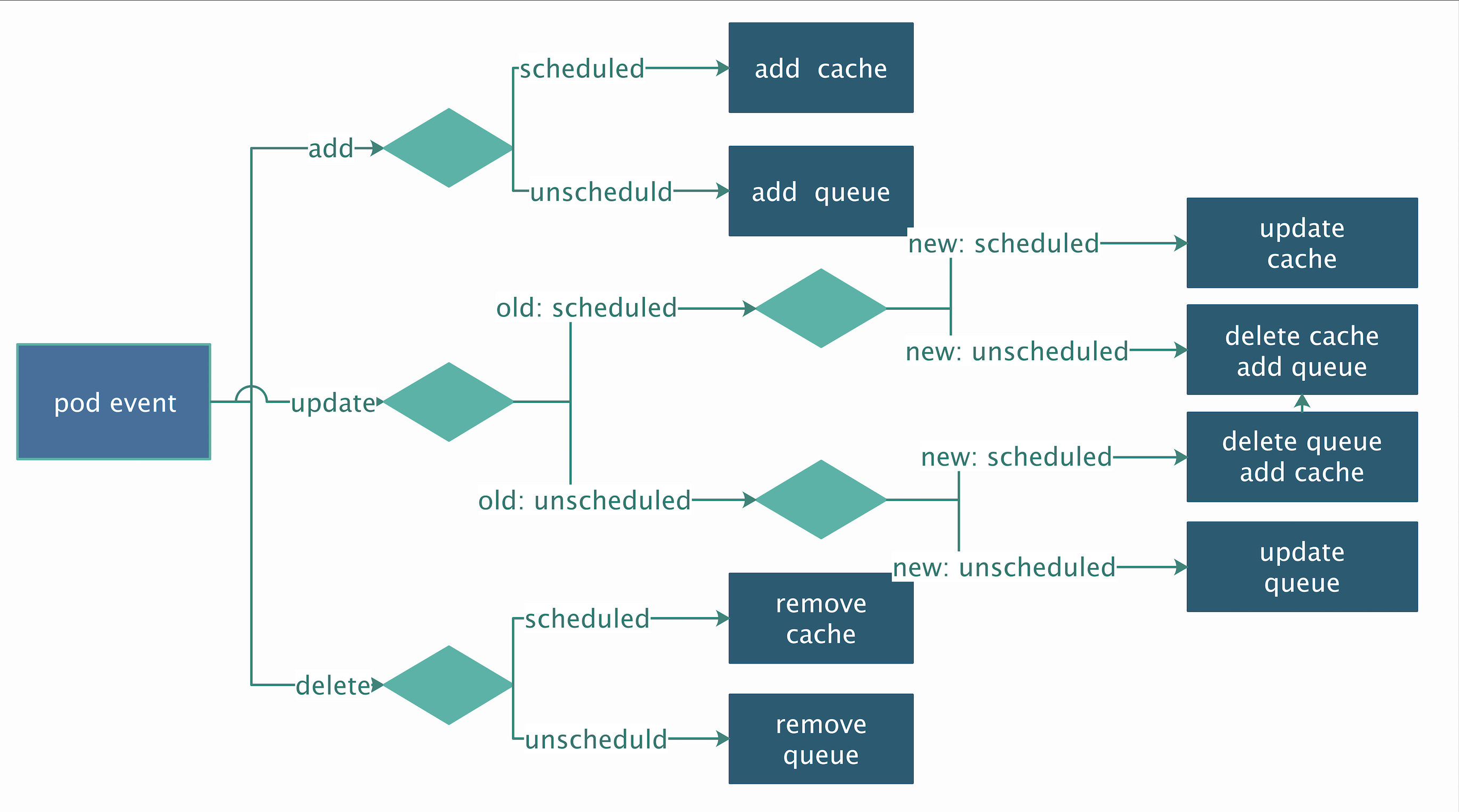 - 默认为FIFO,可选为PriorityQ;PriorityQ包含UnschedulbleQ和ActiveQ(前者会在事件触发时刷到后者,如下图中部分事件);UnschedulbleQ中含有nominatedPods