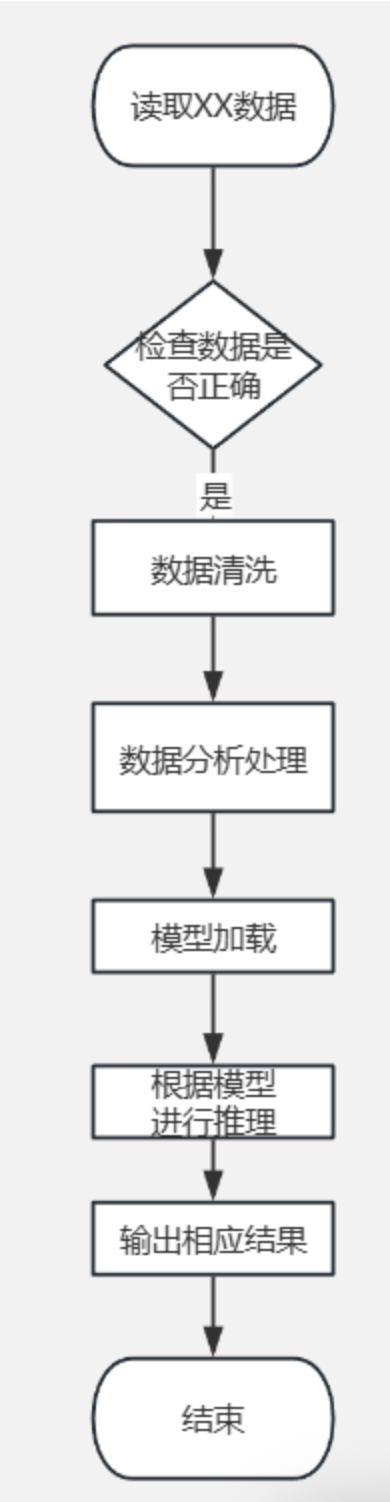 读取xxx数据 ----> 检查数据是否正确<> ----> 数据清洗 ----> 数据分析处理 ----> 模型加载 ----> 根据模型进行处理 ----> 输出相应结果 ----> 结束