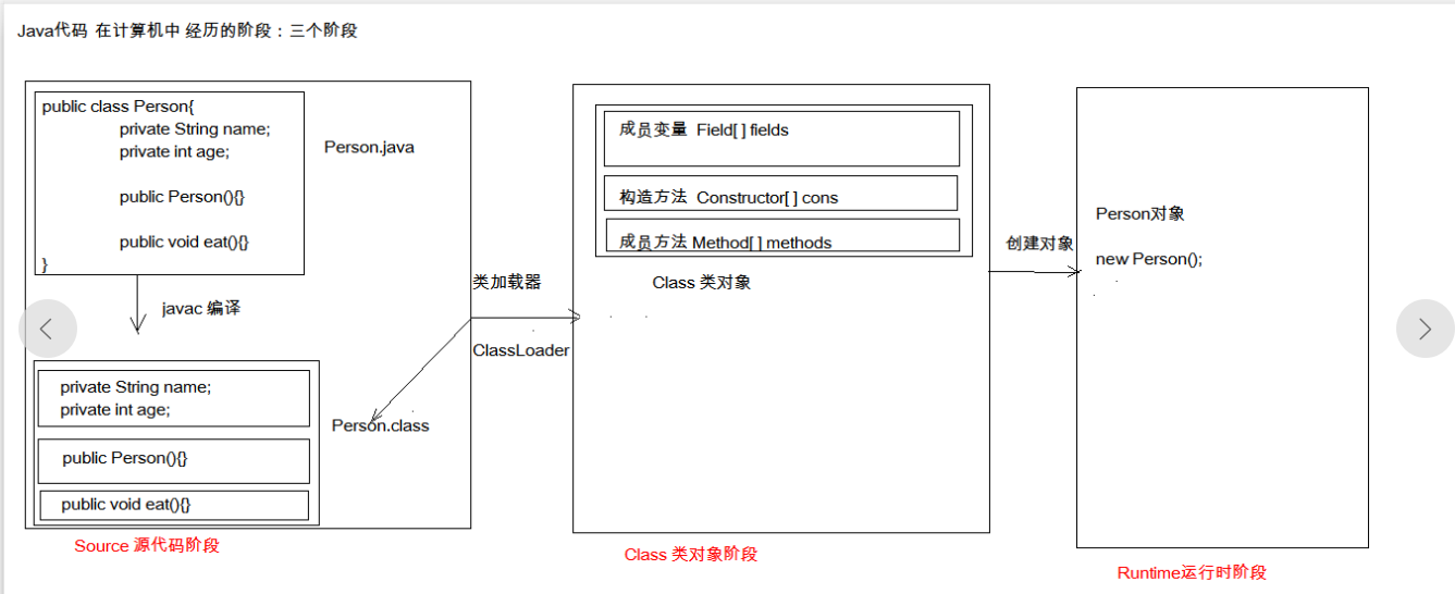 第二阶段:Class对象阶段。通过ClassLoader类加载器将字节码文件加载到内存中,而在内存中会有一个Class对象来描述字节码文件共同的特征和行为,就比如描述成员变量、成员方法、构造方法等。如上图,Class类将成员变量、构造方法、成员方法封装为相应的对象。