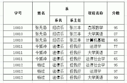 在图三中,虽然我们去掉了数据的冗余,但是当我们删除学号为10010的数据,会发现系名,系主任也会被 删除,这不符合我们所需要的;通过第三范式的概念我们可以知道,在学生表中存在专递依赖,学号-->系名;系名--》系主任;也就是说系主任专递依赖学号;这是我们还需要进行拆分学生表;如下图四所示: