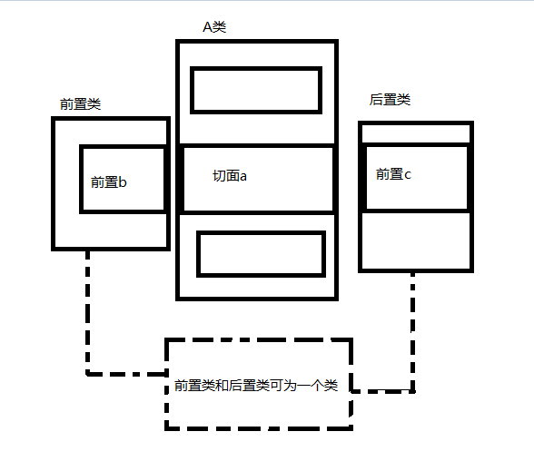 AOP中文名称叫面向切面编程,通俗就是在一个类A的方法a前面添加一个方法b,后面添加一个方法c,而这个b和c方法不属于A类的方法而是来自另一个或者另两个类的方法(其中b叫前置通知,c叫后置通知)。这是为了提高程序的可维护性,同时面向切面编程具有高扩展性,其扩展性就是表现在两个切面。如下图1-1所示。