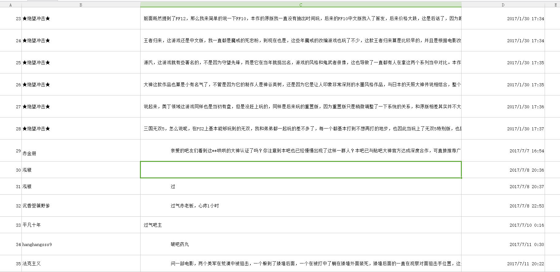 在爬取上文content1.txt的同时,我还将回复人的ID,回复时间一起爬取了下来,并将这3类数据都存放进表单文件AllPagingDetail.csv中。