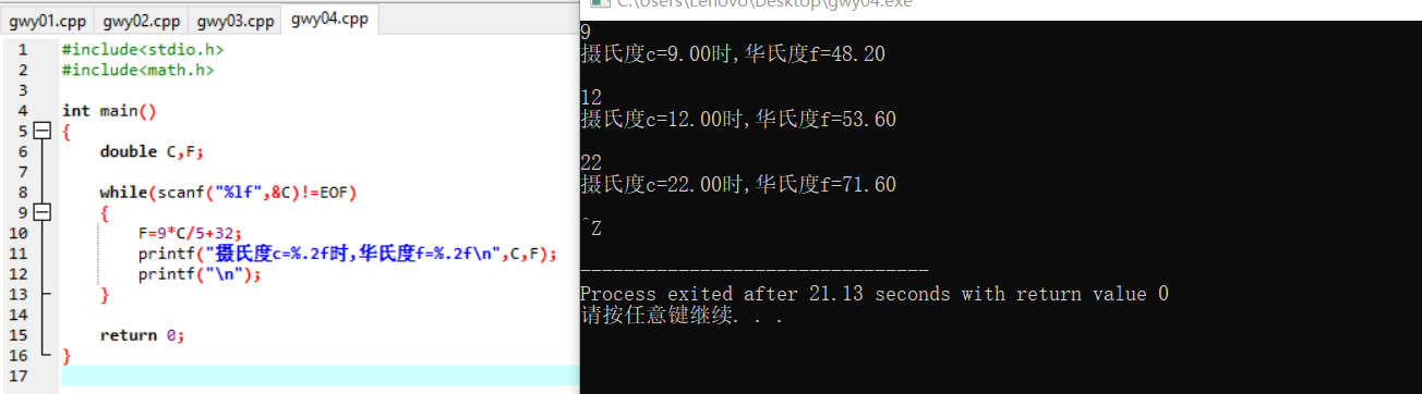 printf("摄氏度c=%.2f时,华氏度f=%.2f\n",C,F);