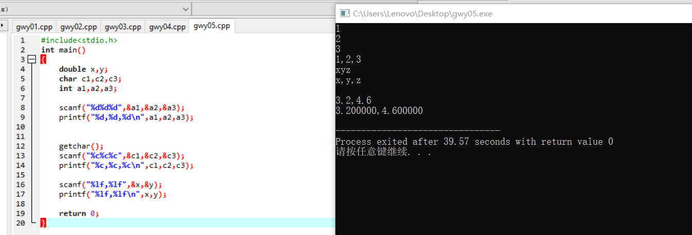scanf("%lf,%lf",&x,&y);