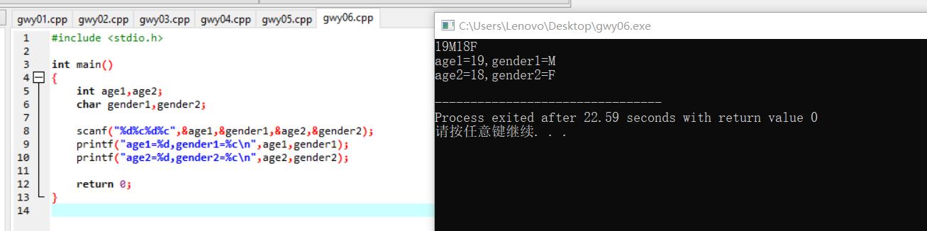 printf("age1=%d,gender1=%c\n",age1,gender1);