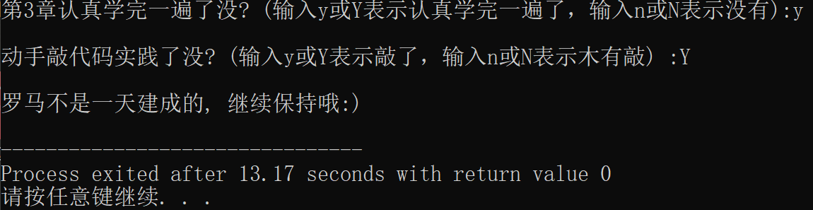 printf("第3章认真学完一遍了没? (输入y或Y表示认真学完一遍了,输入n或N表示没有):");