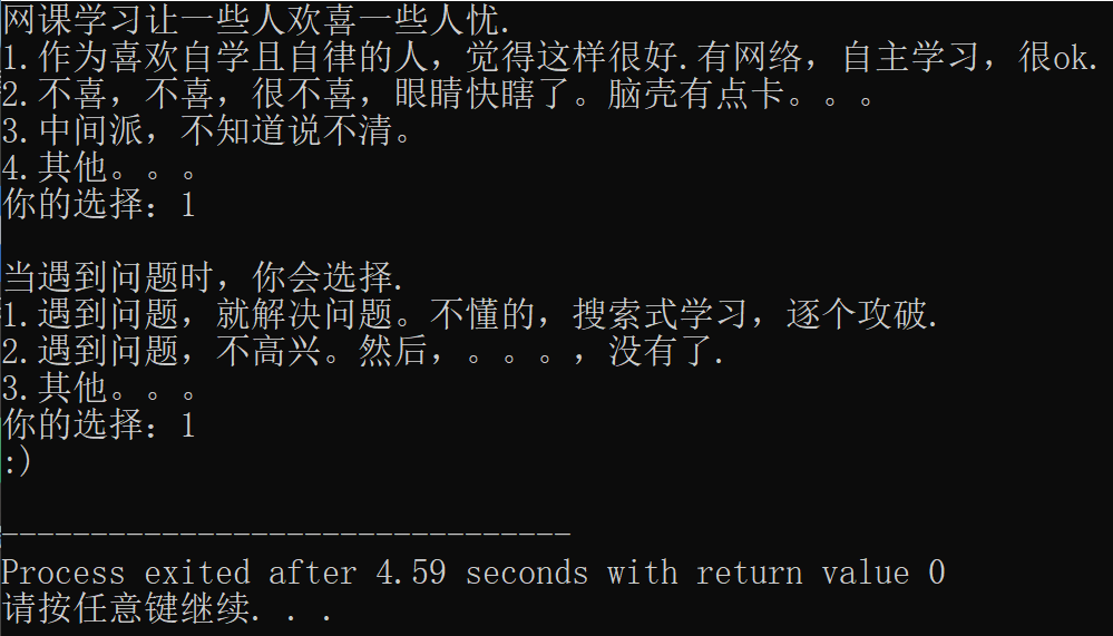 printf("2.遇到问题,不高兴。然后,。。。,没有了.\n");