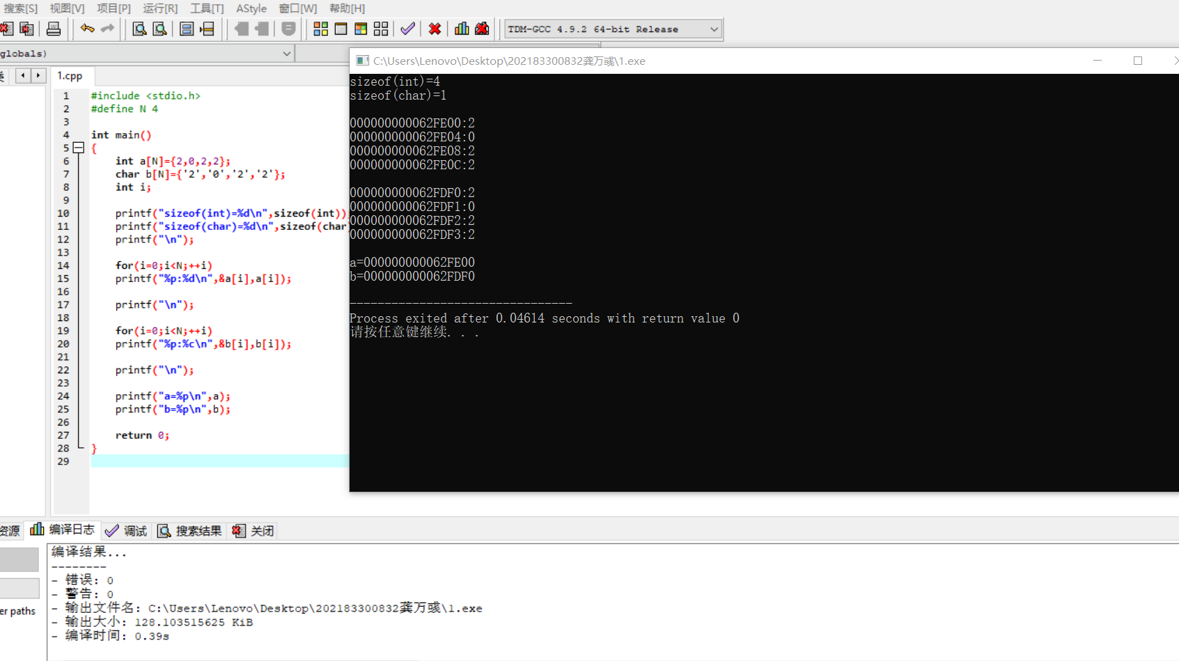 #include <stdio.h> #define N 4 int main() { int a[N]={2,0,2,2}; char b[N]={'2','0','2','2'}; int i; printf("sizeof(int)=%d\n",sizeof(int)); printf("sizeof(char)=%d\n",sizeof(char)); printf("\n"); for(i=0;i<N;++i) printf("%p:%d\n",&a[i],a[i]); printf("\n"); for(i=0;i<N;++i) printf("%p:%c\n",&b[i],b[i]); printf("\n"); printf("a=%p\n",a); printf("b=%p\n",b); return 0; }